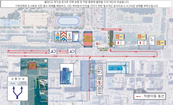 번영로에서 천안시청 방향으로 진입하는 차량은 기존 교량 하류쪽 50m 거리에 조성된 시청 방향 진입만 가능한 2차로의 임시 가교를 이용해야 한다.