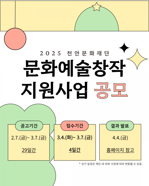 [세종타임즈] 천안문화재단은 오는 3월 4~ 7일 ‘문화예술 창작 지원사업’ 참여자를 모집한다고 24일 밝혔다.