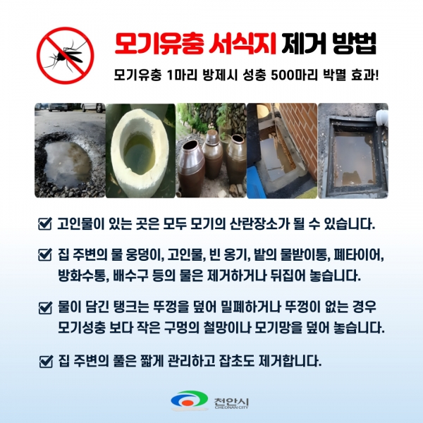 이현기 서북구보건소장은 “철저한 방역소독 실시로 감염병으로부터 안전하고 건강한 천안시를 만들기 위해 최선을 다할 것”이라며 “모기유충 서식지 발견 시 적극적인 신고로 신속한 방역조치가 이뤄질 수 있도록 협조해달라”고 당부했다.