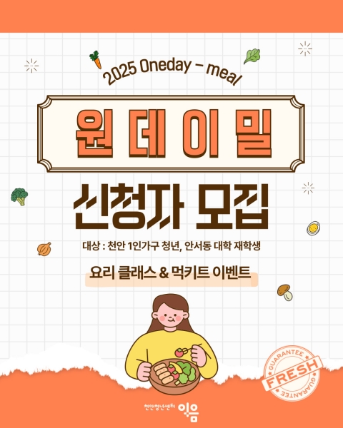 [세종타임즈] 천안시는 요리 경험이 적은 대학생과 1인가구 청년을 대상으로 ‘원데이 밀 클래스’ 와 ‘원데이 밀 먹키트 이벤트’를 운영한다고 17일 밝혔다.