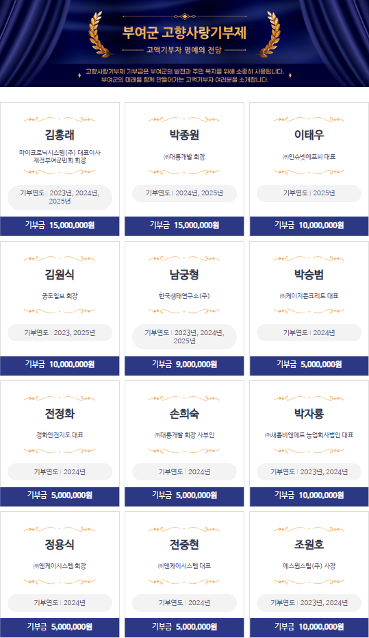 현재까지는 김홍래 재전부여군민회 회장을 비롯해 ㈜대륭개발 박종원 회장, ㈜인슈넷에프씨 이태우 대표 등 22명이 등재되어 있다.