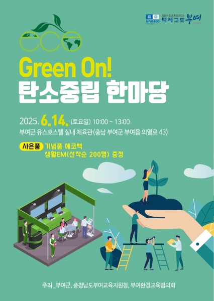 [세종타임즈] 부여군과 부여교육지원청, 부여환경교육협의회가 함께하는 ‘Green On 탄소중립 한마당’ 이 오는 14일 부여군 유스호스텔 실내체육관에서 개최된다.