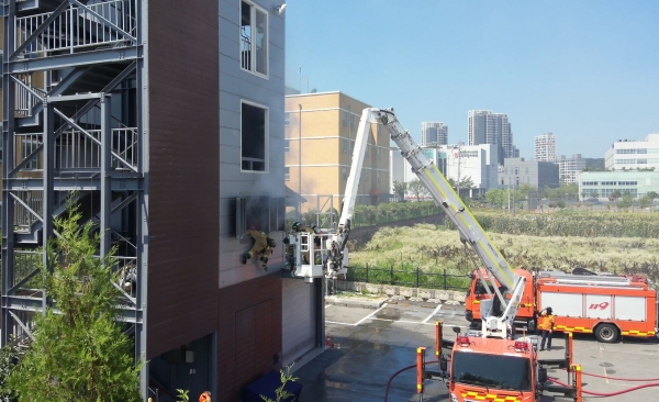 20여명의 대원들은 소형굴절차와 중형펌프차, 물탱크차 각 1대씩을 운용하며 연소 확대 방지, 수관 연장 및 내부 진입을 통한 화재 진압, 비상탈출, 바스켓 인명구조, 지붕 파괴 수직 배연 등 실전 중심의 전술 훈련을 펼쳤다.