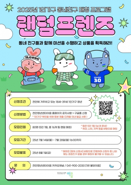 [세종타임즈] 천안시는 천안청년센터 이음이 1인 가구 청년들의 커뮤니티 형성을 위한 동네친구 매칭 프로그램 ‘랜덤프렌즈’ 참여자를 모집한다고 14일 밝혔다.