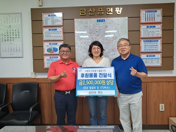 [세종타임즈] 삼이야 푸드는 지난 23일 금산읍행정복지센터를 방문해 취약계층을 위해 250만원 상당 홍삼·쌀 음료 등 170세트를 기부했다이날 기부된 물품은 독거노인 등 어려운 이웃에 전달될 예정이다.