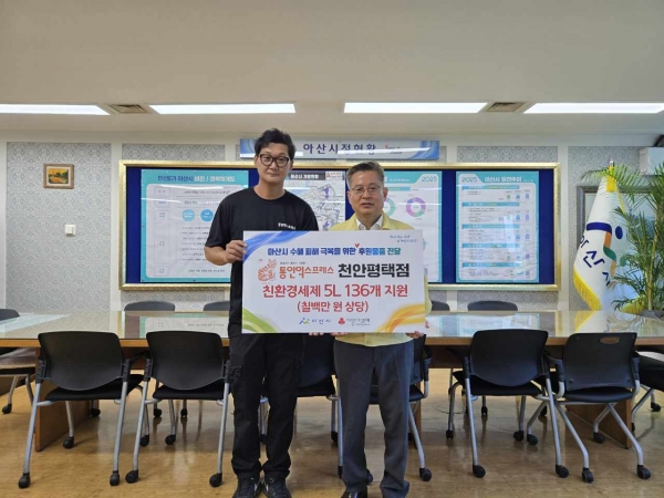[세종타임즈] 아산시는 통인익스프레스 천안평택점으로부터 수해 피해 주민들을 위한 친환경 세제 5L 136개를 기부받았다고 밝혔다.