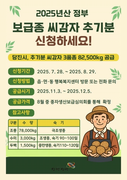 [세종타임즈] 당진시농업기술센터는 농민들의 소득 증가와 안정적인 감자 생산 기반 마련을 위해 8월 29일까지 2025년산 정부 보급종 씨감자 추기분 신청을 받는다고 1일 밝혔다.