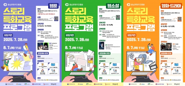 스토리 IP 특화 교육은 웹툰, 웹소설, 영화·드라마 시나리오 등 총 3개 과정으로 구성되며 오는 8월 12일부터 9월 17일까지 총 10차시에 걸쳐 운영된다.