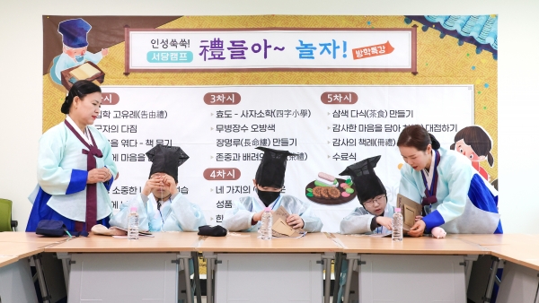 [세종타임즈] 대전평생학습관 예절교육지원센터는 오는 8월 5일부터 7일까지 초등학교 4~6학년 학생 15명을 대상으로 자아존중 및 사회성 증진을 위한 체험형 인성교육 프로그램인‘인성쑥쑥 서당캠프’를 운영한다고 밝혔다.