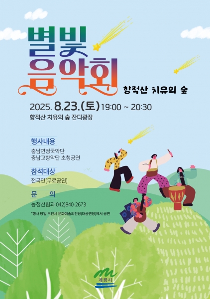 [세종타임즈] 계룡시는 오는 23일 오후 7시부터 8시 30분까지 향적산 치유의 숲 잔디광장에서 ‘향적산 치유의 숲 별빛음악회’를 개최한다고 밝혔다.