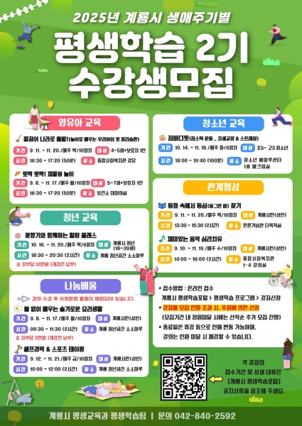 [세종타임즈] 계룡시는 오는 9월부터 11월까지 3개월간 ‘2025년 2기 생애주기별 맞춤형 평생학습 프로그램’을 운영한다고 밝혔다.