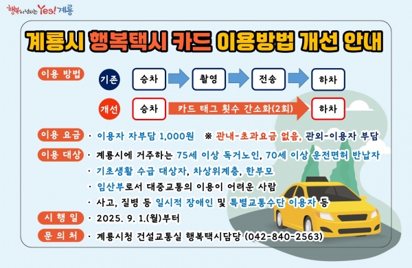 [세종타임즈] 계룡시는 행복택시 이용자의 편의 증진과 경제적 부담 완화를 위해 이용절차와 요금체계를 대폭 개선해 오는 9월 1일부터 시행한다고 밝혔다.
