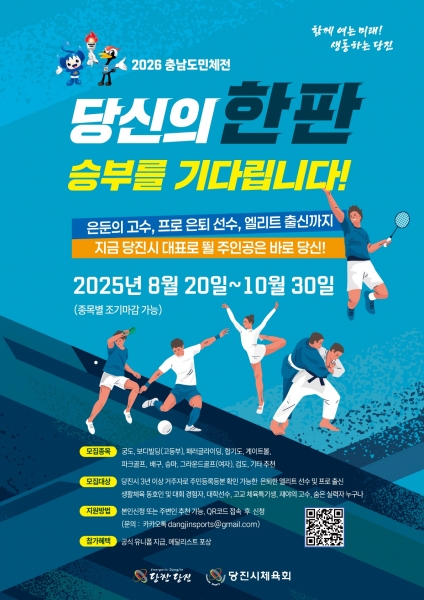 당진시 체육진흥과 관계자는 “도민체전은 단순한 체육대회를 넘어 지역의 명예와 자긍심이 걸린 무대”며 “우리 주변에 숨어 있는 숨은 고수들이 당진시를 대표해 활약할 수 있도록 많은 시민들의 제보와 참여를 부탁드린다”고 전했다.