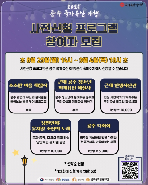 [세종타임즈] 공주문화관광재단은 9월 5일부터 7일까지 개최되는 ‘2025 공주 국가유산 야행’의 사전신청 프로그램 참여자를 모집한다고 밝혔다.