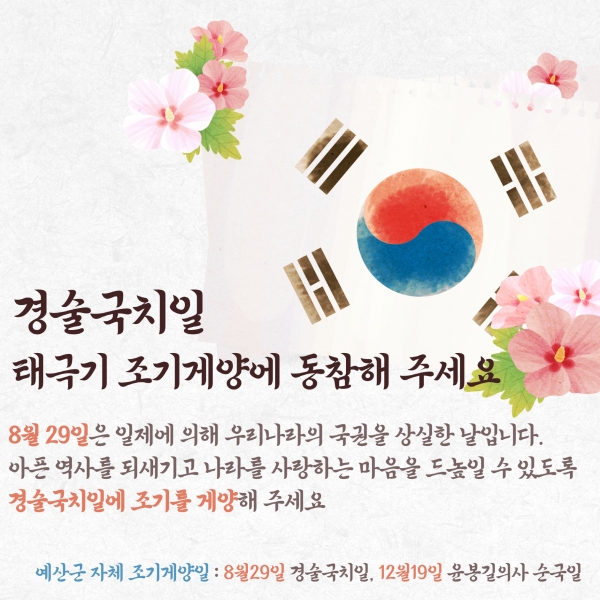 [세종타임즈] 예산군은 8월 29일 경술국치일을 맞아 ‘조기 달기 운동’을 추진한다.
