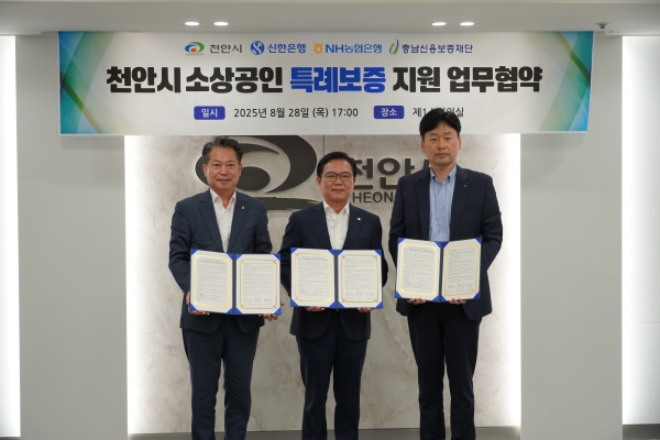 이번 협약식에는 김석필 천안시장 권한대행 부시장, 박장순 농협은행 본부장, 손기석 신한은행 천안중앙금융센터장, 조소행 충남신보 이사장이 참석해 천안시 소상공인의 경영회복 및 지역경제 활성화를 위한 협력 의지를 다졌다.