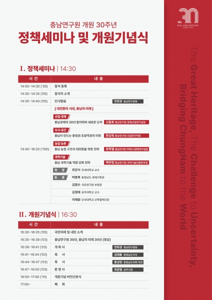충남연구원은 개원 30주년 비전을 “The Great Heritage, The Challenge to Uncertainty, Bridging Chungnam to the World”로 내세웠다.