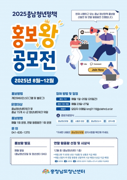 [세종타임즈] 충청남도 내 청년정책을 널리 알리고 청년들의 적극적인 참여를 유도하기 위한 ‘2025 충남 청년 정책 홍보왕 공모전’ 이 활발히 진행되고 있다.