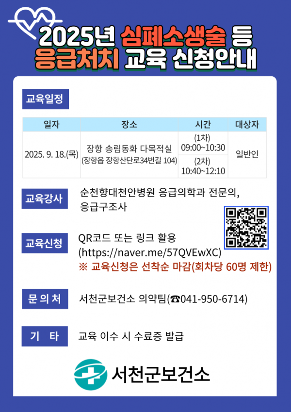 교육은 오는 9월 18일에 장항 송림동화 다목적실에서 오전 9시, 오전 10시 40분 두 차례로 나누어 진행되며 회차별 60명씩 총 120명이 참여할 수 있다.