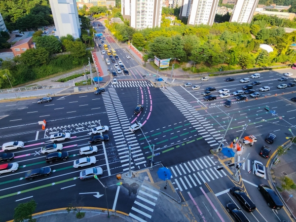 이번 조치는 총 연장 200m 구간에 걸쳐 △1·2차로는 분홍색, △3·4차로는 녹색, △5차로는 연한 녹색으로 색깔 유도선을 도색한 것이 특징이다.