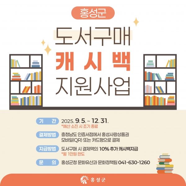 [세종타임즈] 홍성군은 도서구매를 통해 지역 주민의 독서문화를 확산시키고 지역 경제 활성화를 목표로 '홍성군 충남 인증서점 도서구매 캐시백 지원사업'을 5일부터 본격 추진한다고 밝혔다.