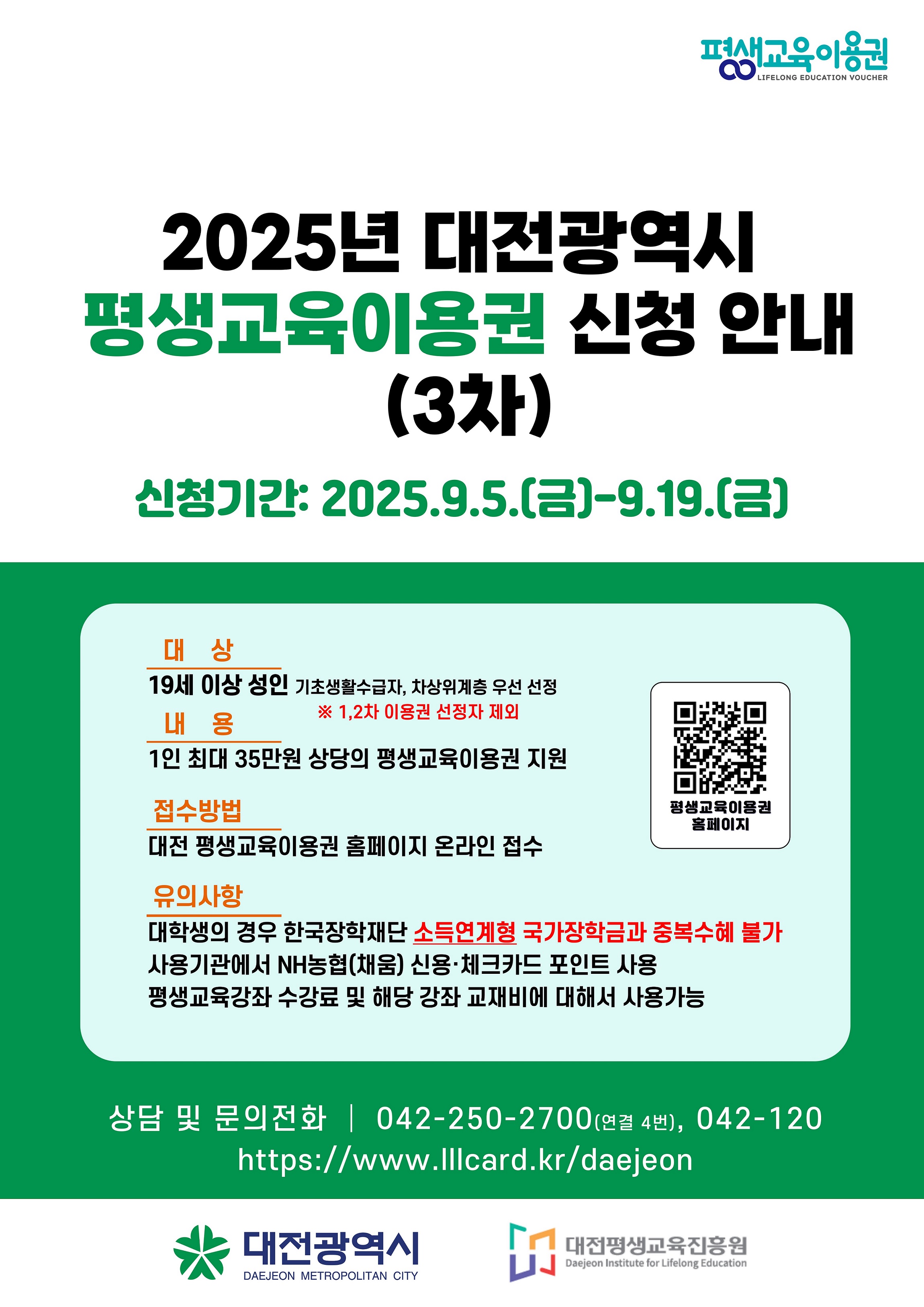 신청 기간은 9월 5일(목)부터 19일(목)까지며, 19세 이상 대전 시민이면 누구나 대전평생교육이용권 홈페이지(www.lllcard.kr/daejeon)를 통해 신청할 수 있다.