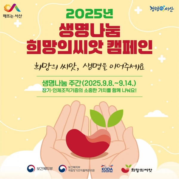 [세종타임즈] 충남 서산시가 9월 9일 장기기증의 날 기념 생명나눔 주간을 맞아 8일부터 14일까지 생명나눔 희망의 씨앗 캠페인을 운영한다.