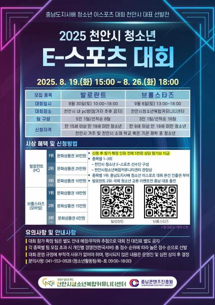 종목별 1위 팀은 오는 13일 센터에서 열리는 ‘2025 충남 도지사배 청소년 E-스포츠 대회’에 천안 대표팀으로 본선에 진출하게 된다.