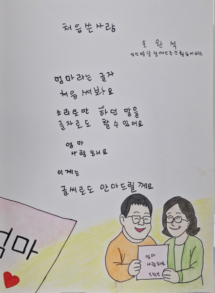 오완석 학습자의 작품 ‘처음 쓴 사랑’은 문해교육을 통해 ‘엄마’라는 단어를 처음 써보며 느낀 그 마음을 표현했고 그는 “숫자와 글씨, 무엇으로도 엄마를 표현해 보고 싶었다”며 “앞으로 더 많은 단어를 배우고 싶다”는 소감을 전했다.