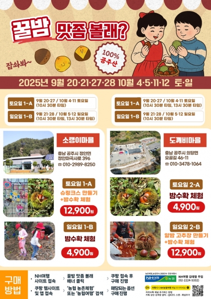 체험비는 공주시와 농협중앙회의 지원으로 밤 줍기 체험만 참여할 경우 4,900원이며 다른 체험을 포함하면 12,900원이다.