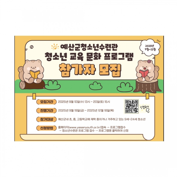 [세종타임즈] 예산군청소년수련관은 관내 청소년들의 건강한 성장 지원과 미래 사회 대비를 위해 마련된 2025년 4분기 청소년 프로그램 참가자를 9월 10일 오후 1시부터 20일 오후 3시까지 모집한다고 밝혔다.