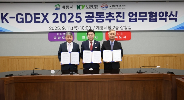 [세종타임즈] 계룡시·건양대학교·국방산업연구원은 11일 계룡시청 상황실에서 오는 18일부터 19일까지 유동리 종합문화체육공원에서 개최되는 ‘K-GDEX 2025, 계룡방산전시회’의 성공적인 추진을 위해 공동 업무협약을 체결하고 본격적인 준비에 돌입했다.