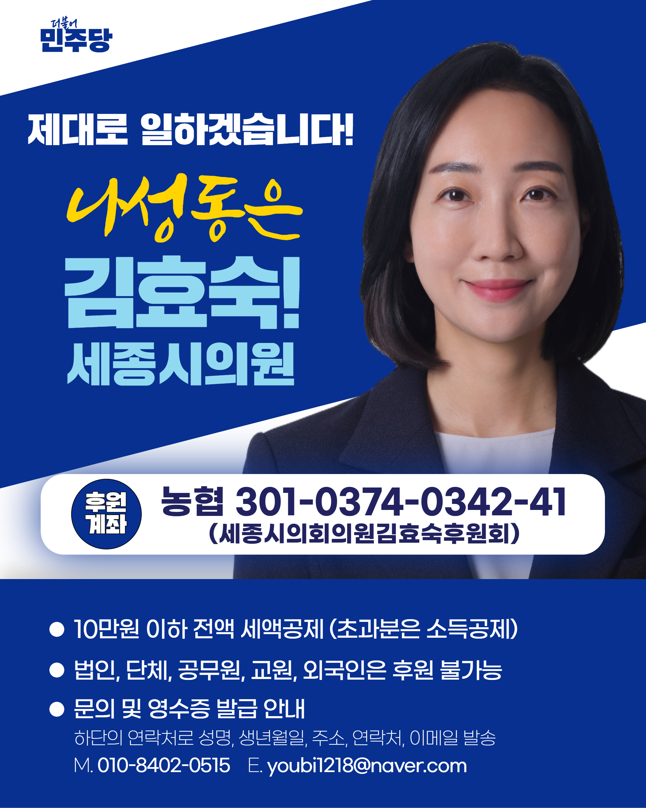 [세종타임즈] 세종특별자치시의회 김효숙 부의장(더불어민주당, 나성동)이 시민의 정치 참여를 확산하고 투명한 정치문화 정착을 위해 세종 지역 광역의원 최초로 후원회를 개설했다.