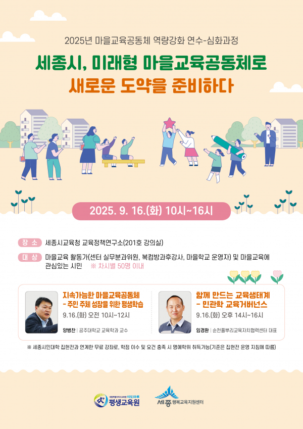[세종타임즈] 세종시교육청평생교육원은 오는 16일 마을교육공동체의 전문성과 지속가능성을 높이기 위해 ‘2025년 마을교육공동체 역량강화 연수’를 성황리에 개최했다.