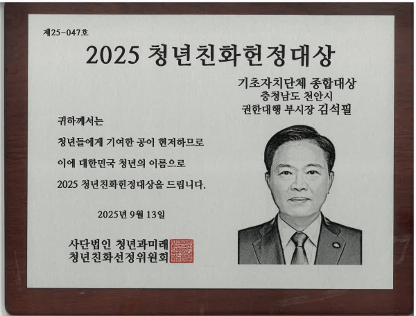 김석필 천안시장 권한대행은 “천안시의 청년정책이 2년 연속 종합대상을 수상하게 된 것은 행정의 노력만이 아니라, 청년들과 함께 고민하고 소통하며 만들어온 성과”며 “앞으로도 청년의 목소리에 귀 기울이며 청년과 함께 미래를 열어가는 도시를 만들어 가겠다”고 밝혔다.
