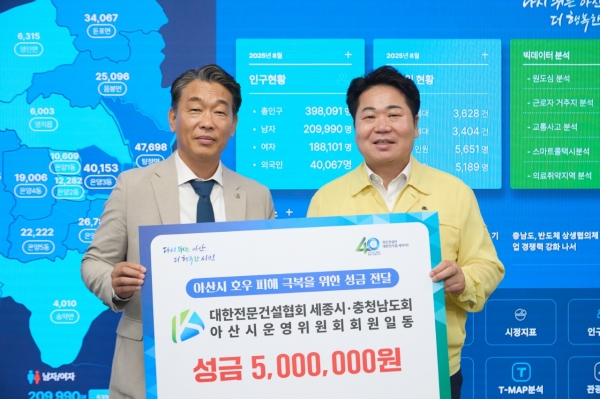 [세종타임즈] 아산시는 17일 대한전문건설협회 세종시⸱충청남도회와 아산시 운영위원회로부터 집중호우로 인한 피해 주민을 돕기 위해 모금한 성금 5백만원을 전달받았다고 밝혔다.