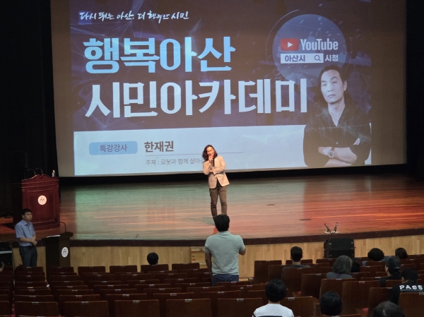 [세종타임즈] 아산시는 16일 평생학습관 아산아트홀에서 행복아산시민아카데미 네 번째 강연으로 한재권 한양대학교 로봇공학과 교수의 ‘로봇과 함께 살아갈 세상’을 진행했다고 밝혔다.