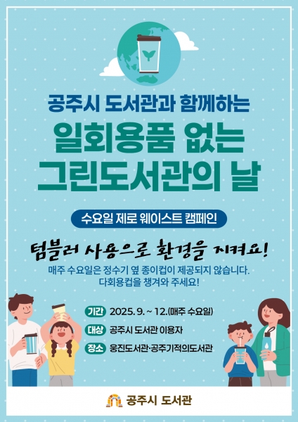 이번 캠페인은 웅진도서관과 공주기적의도서관에서 동시에 진행되며 도서관을 찾는 시민들이 ‘생활 속 제로 웨이스트’를 실천할 수 있도록 참여를 유도한다.