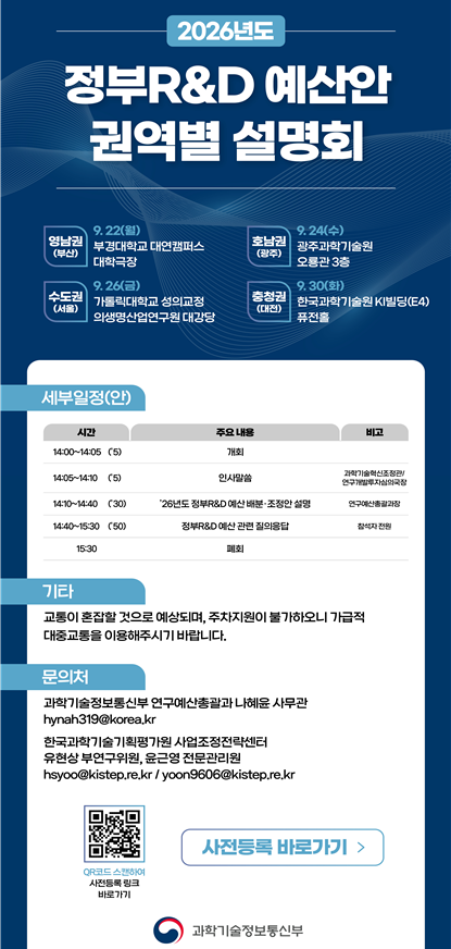 [세종타임즈] 과학기술정보통신부 과학기술혁신본부는 9월 22일부터 수도권, 충청권, 호남권, 영남권 등 4개 권역에서 2026년도 국가연구개발사업 예산안 권역별 설명회를 개최한다고 밝혔다.