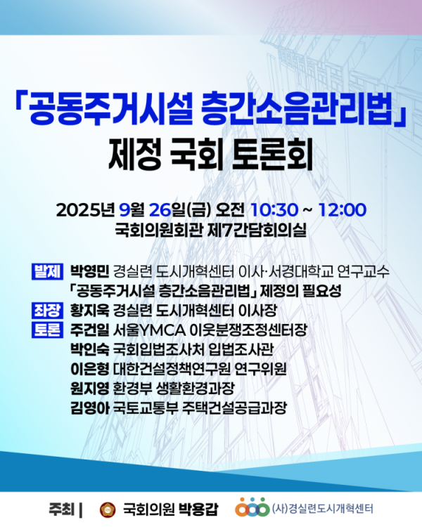 토론에는 주건일 YMCA 이웃분쟁조정센터장, 박인숙 국회입법조사처 입법조사관, 이은형 대한건설정책연구원 연구위원, 원지영 환경부 생활환경과장, 김영아 국토교통부 주택건설공급과장이 참여할 예정이다.