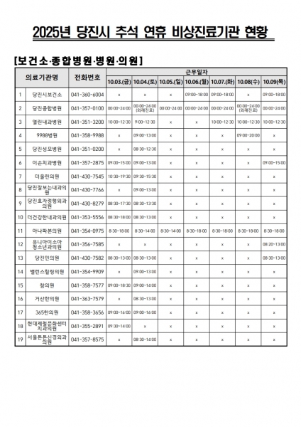 박종규 당진시 보건소장은 “연휴 기간에는 가벼운 질환에 대비해 가정에 상비약을 준비하고 문 여는 병원과 약국을 미리 확인해 두길 바란다”고 당부했다.