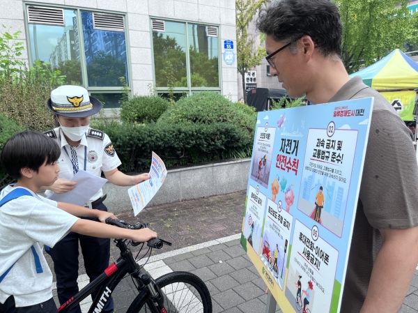 현장에서는 △픽시자전거 도로주행 금지 단속 △자전거 안전모 착용과 과속·음주운전 금지 계도 △보행자 무단횡단 금지 안내와 홍보물 배포가 진행됐다.