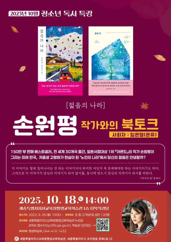 [세종타임즈]세종시교육청평생교육학습관(관장 김희경, 이하 평생교육학습관)이오는 10월 18일(토) 오후 2시, 소설가이자 영화감독인 손원평 작가를 초청해 책마당(북콘서트)를 개최한다.