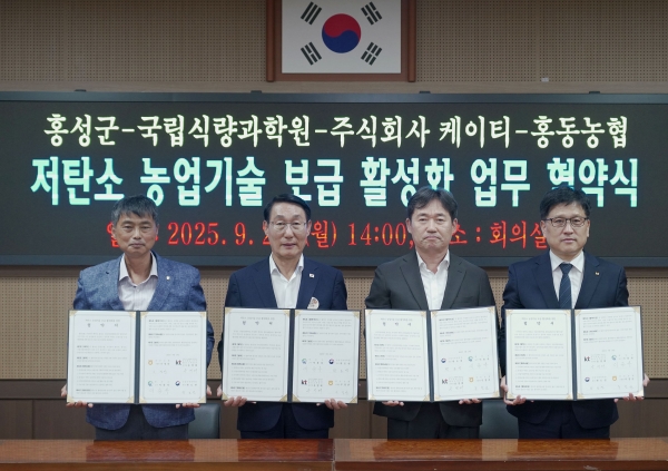 [세종타임즈] 홍성군은 29일 국립식량과학원, KT, 홍동농협과 함께 저탄소 농업기술 보급 활성화를 위한 4자간 업무협약을 체결했다고 밝혔다.