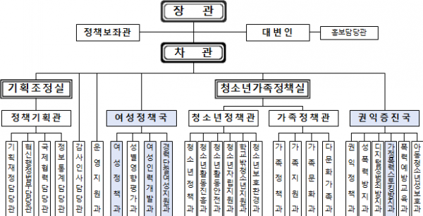 성평등정책실을 신설해 성평등정책관, 고용평등정책관, 안전인권정책관을 소속으로 두고 성평등 정책을 종합적으로 추진한다.