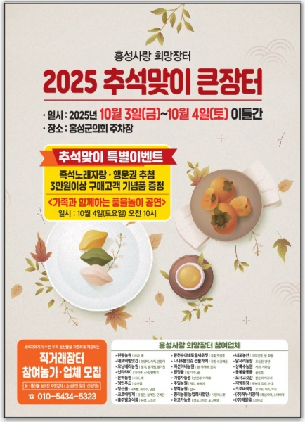 장이진 농업정책과장은 “이번 추석맞이 희망장터를 통해 품질 좋은 홍성 농특산물을 합리적인 가격에 구입해 명절 비용 부담을 덜고 풍성하고 따뜻한 명절을 보내시길 바란다”고 말했다.