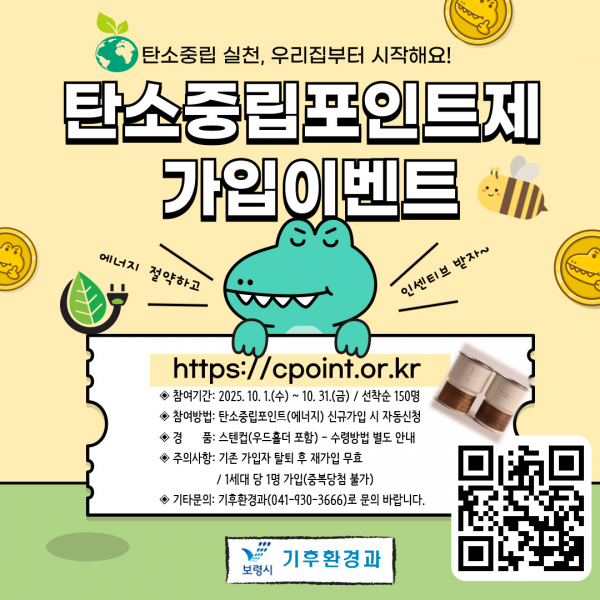 [세종타임즈] 보령시는 탄소중립 실현과 온실가스 감축을 위한 시민 참여 확대를 목표로 탄소중립포인트제 에너지 분야 신규가입자 대상 기념품 증정 이벤트를 10월 31일까지 실시한다고 밝혔다.