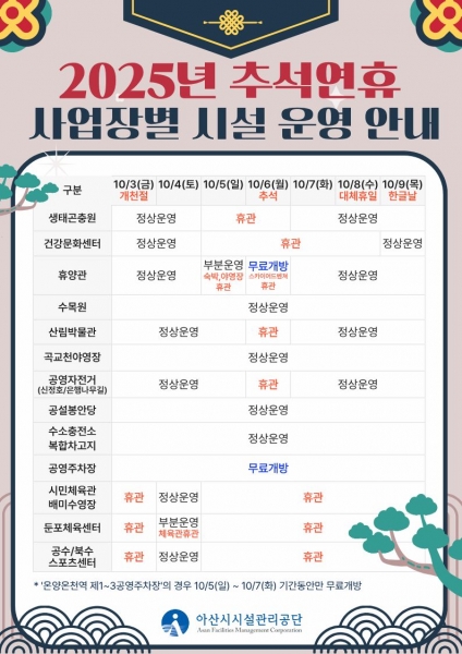 [세종타임즈] 아산시시설관리공단은 민족 대명절인 추석 연휴를 맞아 시민들이 안전하고 편안하게 공단 운영 시설물을 이용할 수 있도록 사업장별 운영 일정을 안내하고 연휴기간 중 안전관리에 만전을 기할 계획이다.