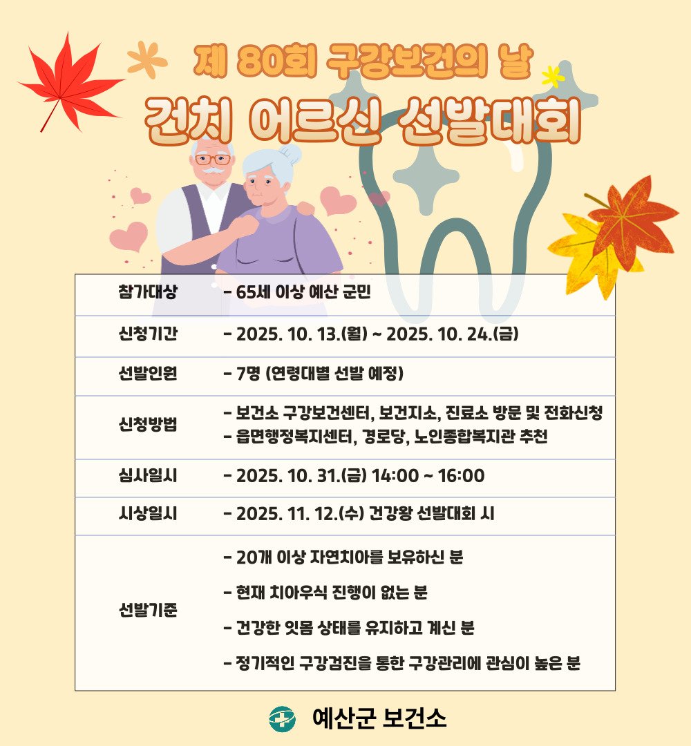 [세종타임즈] 예산군보건소는 ‘제80회 구강보건의 날’을 맞아 건강하고 활기찬 구강생활 실천 분위기 조성을 위해 건치어르신 선발대회를 개최한다.