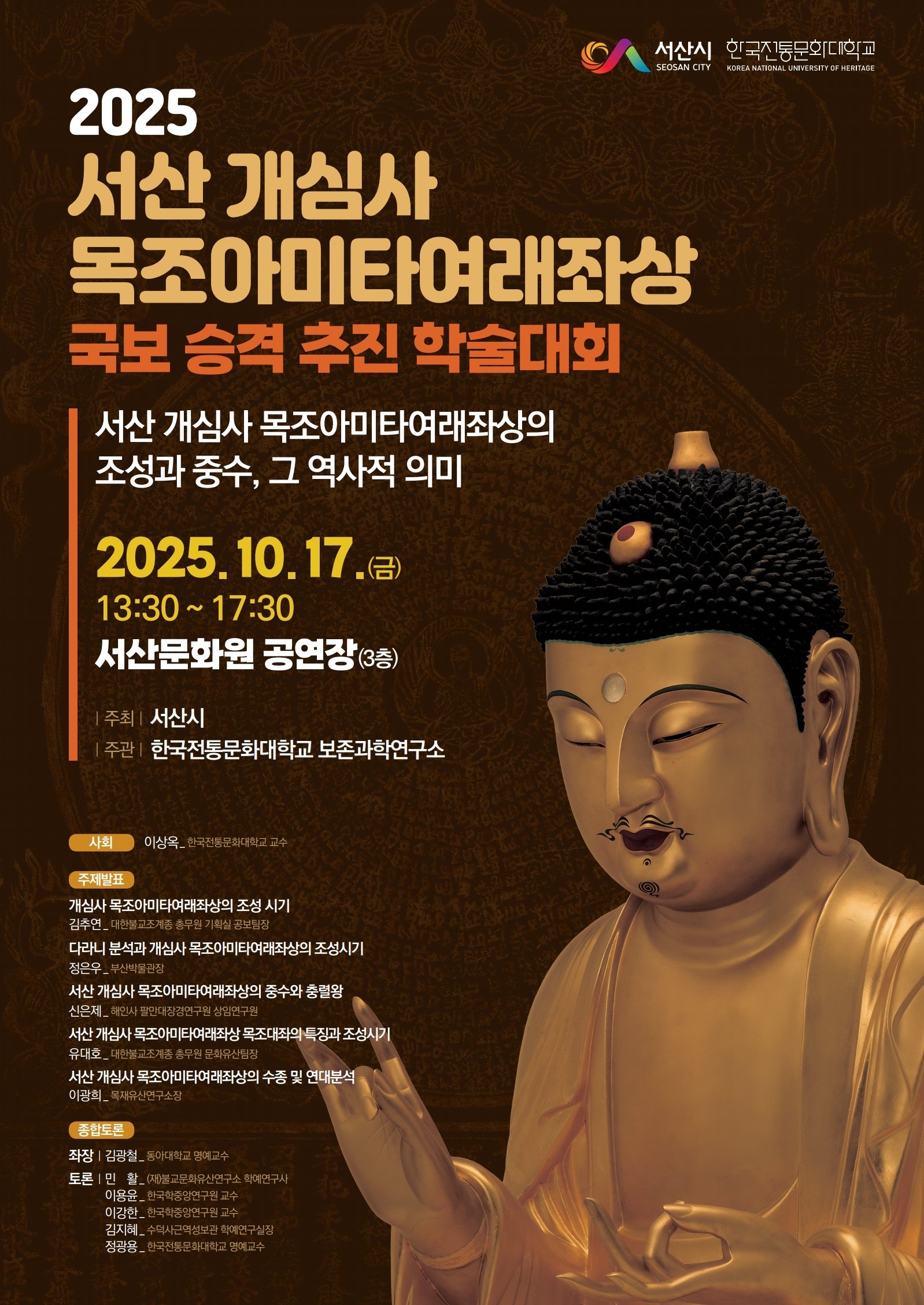 한국전통문화대학교 보존과학연구소와 함께 개최하는 이번 학술대회는 ‘서산 개심사 목조아미타여래좌상의 조성과 중수, 그리고 역사적 의미’를 주제로 열린다.
